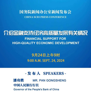 国务院新闻办公室于9月24日上午9时举行新闻发布会,请中国人民银行行长潘功胜、国家金融监督管理总局局长李云泽、中国证券监督管理委员会主席吴清介绍金融支持经济高质量发展有关情况,并答记者问。