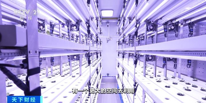 上海市农业科学院设施园艺所科研人员 苗辰:我们创新设计出了可移动式的垂直吊挂栽培架,移动就是将架子左右横移,均匀地排列在整个箱体的空间内,让植株在行距上有更大的空间去利用,来保证植物的生长良好和更好的通气性。