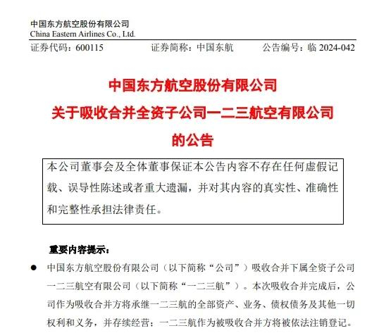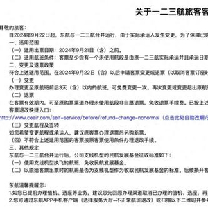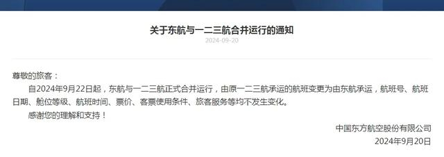 此前的9月20日,东航公告称,自2024年9月22日起,东航与一二三航正式合并运行,由原一二三航承运的航班变更为由东航承运,航班号、航班日期、舱位等级、航班时间、票价、客票使用条件、旅客服务等均不发生变化。