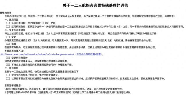东航官网最新通告显示,由于实际承运人发生变更,为了保障已购买一二三航航班旅客的合法权益,中国东航特别制定了相关客票退改规定。