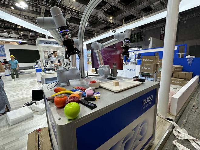 在中科新松展台,多可协作机器人携全系列3-30kg协作机器人及20+主题应用亮相。多可协作机器人将AI和大模型进行深度融合,可实现书法机器人、拍照机器人以及双臂具身智能抓取等。其中,多可协作双臂具身智能抓取站可以通过语音指令,让它准确抓取苹果、牙膏等物品,完成从物体识别、抓取规划到精准放置的全过程。