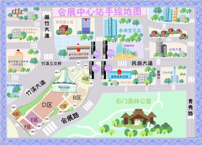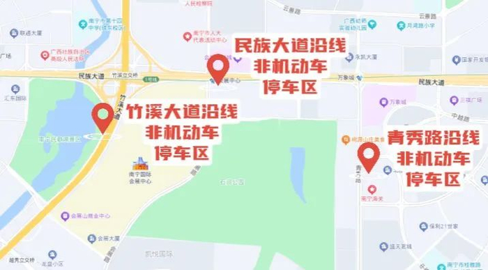 需要骑电动自行车或共享交通工具出行的朋友,可以选择竹溪大道、民族大道以及青秀路沿线的非机动车停车区停放。