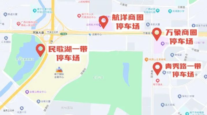 由于东博会期间,南宁国际会展中心周边实行临时交通限行,南宁国际会展中心不开放公众机动车停车场和非机动车停车场,在公众开放日当天前来逛展的朋友,可以把车停放在会展中心周边的航洋商圈、万象商圈,或青秀路一带、民歌湖一带的停车场,然后步行前往会场。