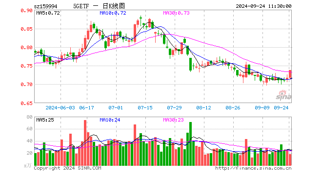 9月24日,截止午间收盘,5GETF(159994)涨2.93%,报0.738元,成交额1342.02万元。5GETF(159994)重仓股方面,立讯精密截止午盘涨3.70%,中际旭创涨7.43%,工业富联涨8.34%,中兴通讯涨1.00%,新易盛涨6.22%,兆易创新涨3.30%,紫光股份涨1.85%,沪电股份涨3.79%,中航光电涨2.52%,歌尔股份涨2.25%。