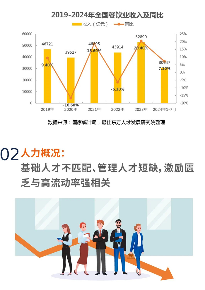 综上所述,2023-2024年中国餐饮业面对新的经济周期和市场需求变化,需要不断创新和调整经营策略,以适应市场变化并抓住新的发展机遇。本报告下的人力资源将在以上背景中分析展开,如何破解人力资源难题并助推生产效率升级是餐饮业人力发展的核心课题。