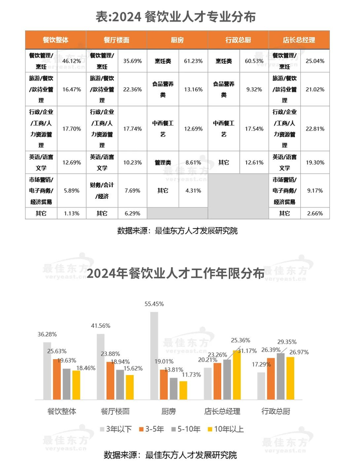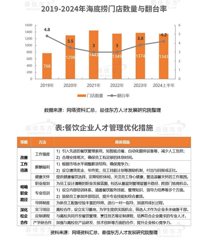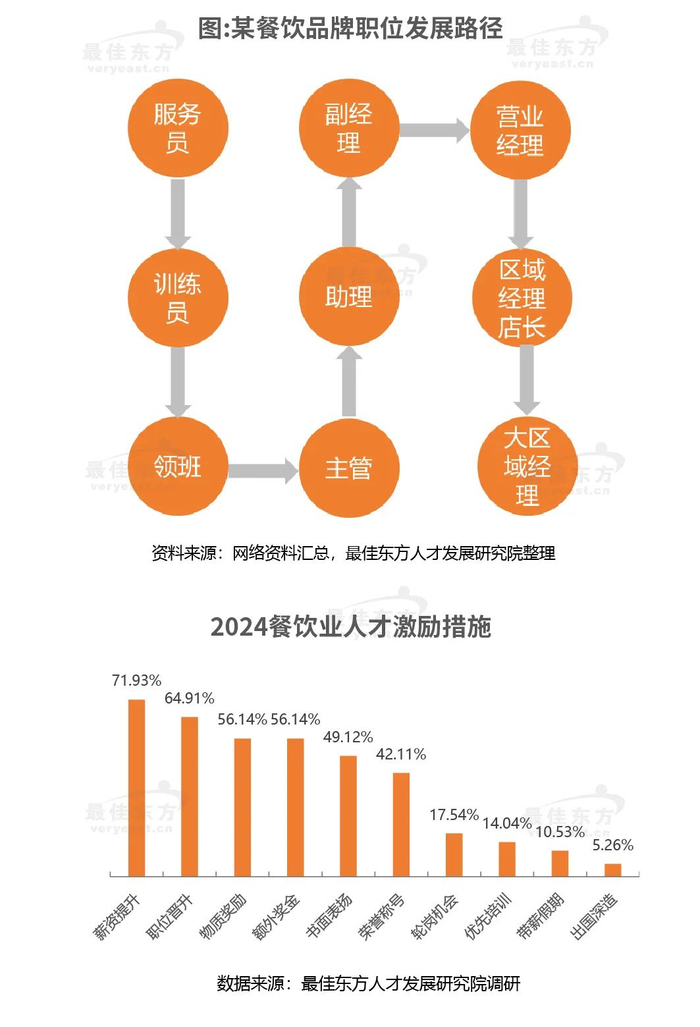 最佳东方基于多年行业观察和一线调研发现,近年来餐饮业人力资源主要存在如下问题:第一,基础人才不匹配与技能提升挑战。基础人才(如厨房工作人及基层服务人员)教育体系与市场需求的不匹配。传统师徒制虽能传承技艺,但缺乏系统性和科学性,限制了行业整体技能水平的提升。同时,社会观念对服务行业的偏见,使得年轻人对这一职业路径兴趣不足。第二,高级管理人才短缺与培养机制不足。高级管理人才的匮乏,主要源于企业对人才培养的忽视以及高技能人才的市场流动性。餐饮企业受限于成本考虑,往往难以投入资源进行长期的人才培养,同时,具有专业管理能力的人才在面对职业发展瓶颈和更高薪酬诱惑时,易选择跳槽或转行。第三,员工流失率高与工作环境优化。餐饮业员工流失率高的原因多样,包括工作性质对年龄、经验等条件的限制,晋升渠道不畅,以及行业内部竞争激烈等。这些因素共同作用下,使得员工难以获得职业满足感和稳定性。第四,绩效考核不明确与薪酬缺乏激励。餐饮企业的绩效考核往往缺乏清晰的目的设定,考核指标模糊且多以定性为主,难以量化,员工容易产生误解和抵触情绪,薪酬体系与绩效考核结果脱节,员工薪酬的高低与工作表现的好坏关系不大,缺乏公平性,难以激发员工的工作积极性和创造性。