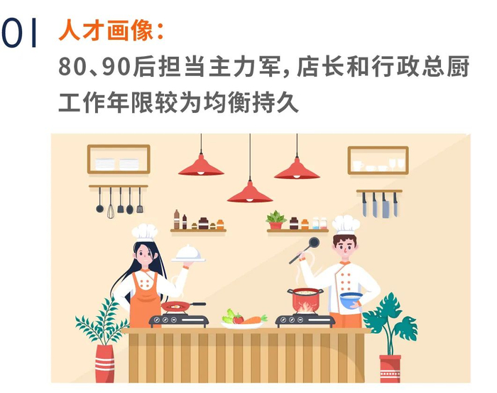年龄分布来看,餐饮业人才整体呈现年轻化趋势:90后位居首位,占比达39.56%;80后位列其后,占比达35.12%。餐厅楼面相较于厨房90后占比稍高;行政总厨相较于店长总经理80后占比稍高。学历分布来看,餐饮人才基础操作人才占比较多,因此中专/高中、高职/大专学历占比最多,其中,店长总经理整体学历水平较高,本科及以上水平占比为9.36%。专业背景来看,46.12%餐饮人才毕业于餐饮管理/烹饪这一大类专业,厨房和行政总厨在烹饪类专业占比均超过60%,与整体餐饮人才相比,店长总经理级复合专业背景明显,有31.98%的人才毕业于企业/行政/工商/人力资源管理和市场营销/电子商务/经济贸易这两类专业。工作经验来看,与整体餐饮人才、楼面服务人才和一线后厨人才相比,店长总经理和行政总厨工作年限较为均衡持久,10年以上工作年限占比均在25%以上,远超上述3类。