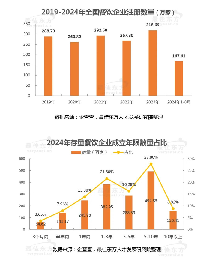 2023年,餐饮行业收入首次跨越5万亿元大关,同比增长超过20%,这一数据直观地反映了消费者信心的恢复和内需市场的强劲;2024年1-7月,同比增幅跌至7.10%,居民消费升级疲软态势凸显。2023新增餐饮注册量创下新高,出现了疯狂的“报复性开店”;2024年存量企业来看,成立3年以下占比超过45%,大量门店关闭,“极度内卷”时代下餐饮企业运营明显承压,餐饮业迎来了极其特殊的一个新发展周期。