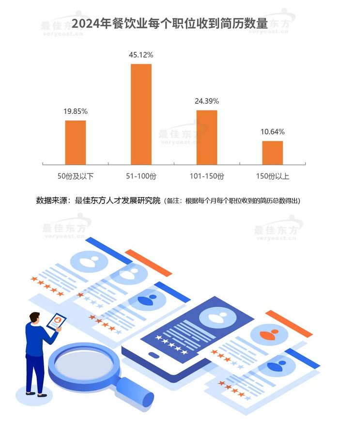 随着数字化技术的普及,餐饮企业的招聘过程也越来越倾向于网络渠道,从简历投递、筛选到面试、入职等各个环节都可以通过线上平台完成,最佳东方数据显示:餐饮业人才招聘渠道占比最大的是网络平台,为87.72%。对于雇主来说,餐饮企业在招聘过程中越来越注重品牌形象的展示,通过发布企业文化、员工风采等内容,吸引求职者的关注和认同,提高招聘效果。近年来,招聘流程外包(RPO)在餐饮行业逐渐兴起,企业将招聘流程外包给专业的人力资源公司,可以减轻企业的招聘负担,最佳东方调研显示,其比例为8.77%。