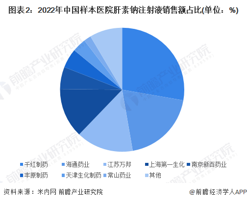 2022年,米内网监测的样本医院内肝素钠注射液市场主要被千红制药、海通药业、江苏万邦、上海第一生化分割,4家企业市场份额均在10%以上。