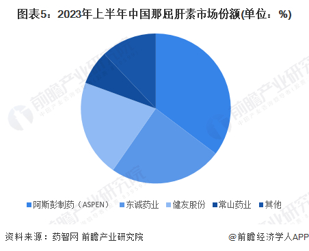 2023年上半年,那屈肝素市场被阿斯彭、东诚药业、健友股份、常山药业瓜分。其中,阿斯彭制药(ASPEN)的市场份额达到35%,东诚药业、健友股份的市场份额均在20%以上。