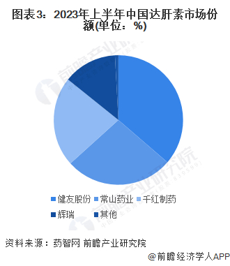 2023年上半年,达肝素市场被健友股份、常山药业、千红制药、辉瑞瓜分,其中健友股份市场份额占比达到36%,常山药业、千红制药市场份额均在20%以上。