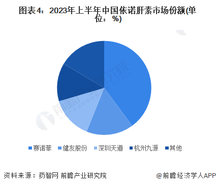 2023年上半年,依诺肝素市场主要被赛诺菲、健友股份、深圳天道、杭州九源等企业瓜分。其中,赛诺菲独占40%的市场份额,健友股份、深圳天道、杭州九源市场份额均在10%以上。