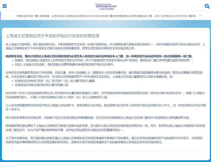 上海迪士尼度假区方面表示,新购票政策与国内大部分旅游目的地的相关政策保持一致,其推出秉承了度假区不断提升游客体验的承诺;新政策也是度假区与政府相关部门紧密合作、合力打击严重损害度假区声誉、业务和正常运营的非法商业活动的重要举措之一。