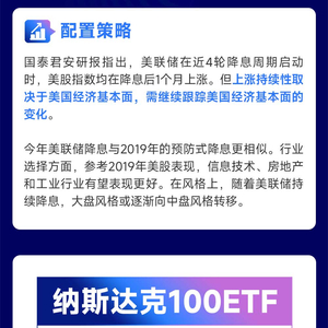 国泰君安研报指出,美联储在近4轮降息周期启动时,美股指数均在降息后1个月上涨。但上涨持续性取决于美国经济基本面,需继续跟踪美国经济基本面的变化。今年美联储降息与2019年的预防式降息更相似。行业选择方面,参考2019年美股表现,信息技术、房地产和工业行业有望表现更好。在风格上,随着美联储持续降息,大盘风格或逐渐向中盘风格转移。