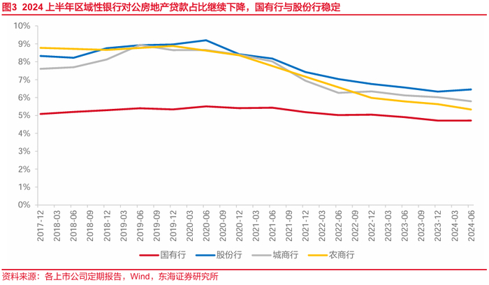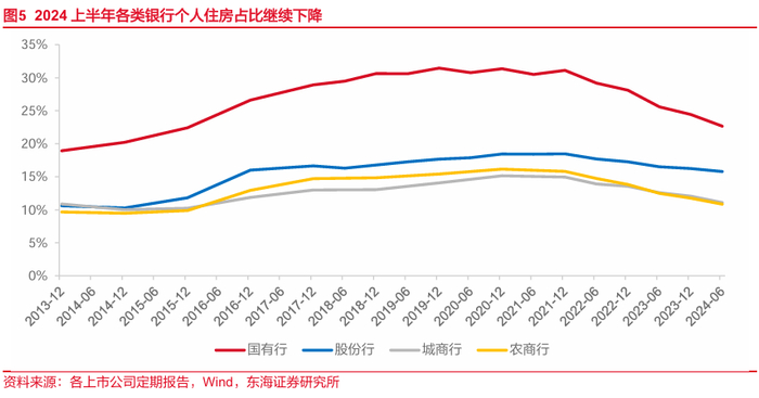 个人住房贷款:至2024Q2末,上市银行个人住房贷款规模约为34.13万亿元,较2023年末下降约3200亿元,占总贷款的比重约为20%,下降约1.37个百分点(图4所示)。其中,国有行受市场需求较弱、提前还款意愿较强等因素影响,个人住房贷款规模延续下降(图5所示);股份制银行与城商行在北京、长三角、珠三角等区域占比较高,“5.17新政”后相对受益,个人住房贷款规模稳中略有增长;农商行受县域需求较弱影响,规模继续下降。