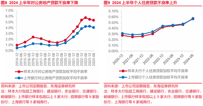 对公房地产贷款:2023年以来,房地产政策积极,开发商违约面积明显收敛,不良斜率明显放缓。2023下半年,开发商融资支持力度较大且前期不良处置效果体现,不良率拐点初现。2024上半年,化解风险效果依然体现,不良率进一步下降。测算19家样本银行对公房地产贷款加权平均不良率(图8所示)自4.26%(2023年末)下降至4.04%(2024年6月末)。同期,大行对公房地产贷款不良率由5.48%下降至5.32%。