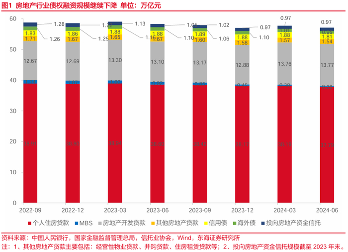 2024Q2末,房地产行业债权融资规模(图1所示)为57.11万亿元,与上次跟踪时(截至2024Q1末)相比,下降约6455亿元。结构上来看,居民端下降约5000亿元至38.07万亿元,一方面体现Q2住房需求弱势延续,另一方面体现提前还款意愿或随“5.17新政”后存量与新增贷款利差扩大而再次加强。对公开发贷增加约100亿元至13.77万亿元,体现银行业响应融资协调机制,对白名单项目的支持效果,但动能较Q1明显放缓;其他债权方面,房地产其他对公贷款(主要包括经营性物业贷、并购贷等)、房地产信用债、海外债规模小幅下降,体现现阶段弱势市场环境下开发商面临的融资约束依然较强。