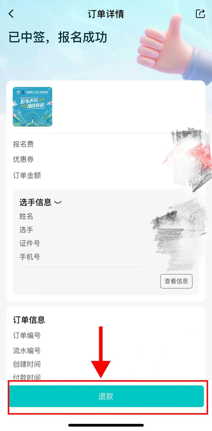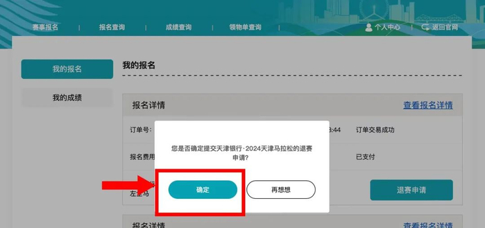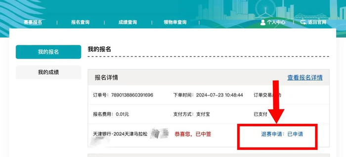 进入天津马拉松官网,点击【个人中心】,登录账号后在【我的报名】中选择赛事“天津银行·2024天津马拉松”。在报名详情对话框右下角点击【退赛申请】;