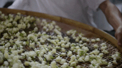 窨制结束后,茉莉花茶还有一个工序——起花。茉莉花属于气质型花,随绽放吐香,未开或开败后,芳香即随花瓣一同香消玉殒。经历窨制过程,力竭的茉莉将自己的香气全然寄存在茶里,花朵便需要被筛离,以免后续因为花的衰败影响整体香气,这便是“起花”。大多数茉莉花茶“见茶不见花,只有香”道理就在这里。