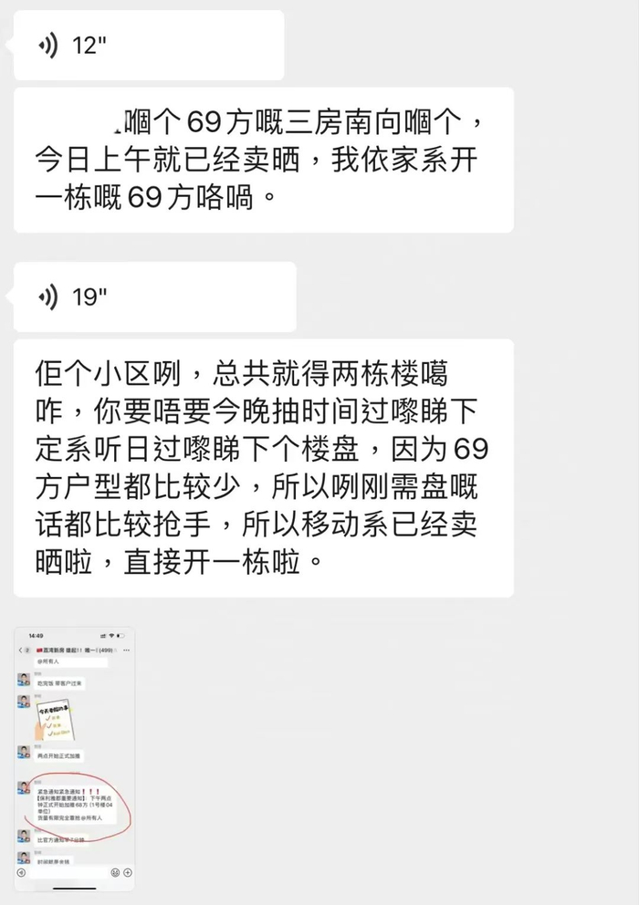 还有一位粉丝晒出和销售的聊天记录,连夜call察叔,说保利雅郡69平已经清盘了!还涨价了!
