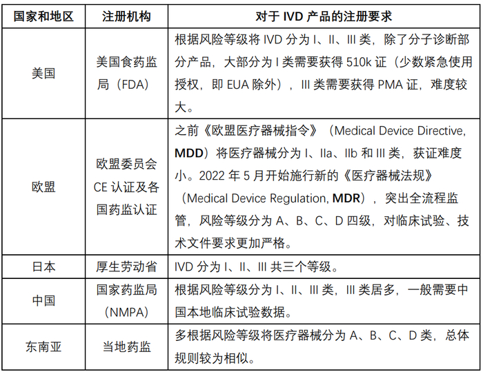 欧盟、美国等成熟市场已经制定了较为完善的IVD产品注册标准。近十年来,东南亚国家也开始逐步建立相关市场准入标准,针对IVD产品的监管经历了从宽松到严格的过程,相关审查参考CE、FDA的认证标准。整体来说,东南亚对于IVD产品的注册要求更为宽松,一般不需要对生产厂家进行现场审核,各国对于IVD产品的注册均有特定的规定,具体如下: