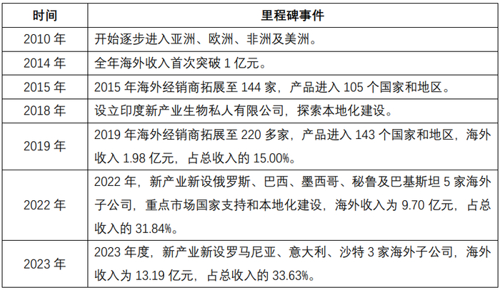 以新产业(300832)为例,新产业自2010年开始逐步发展出海业务,其开拓海外业务的里程碑事件如下: