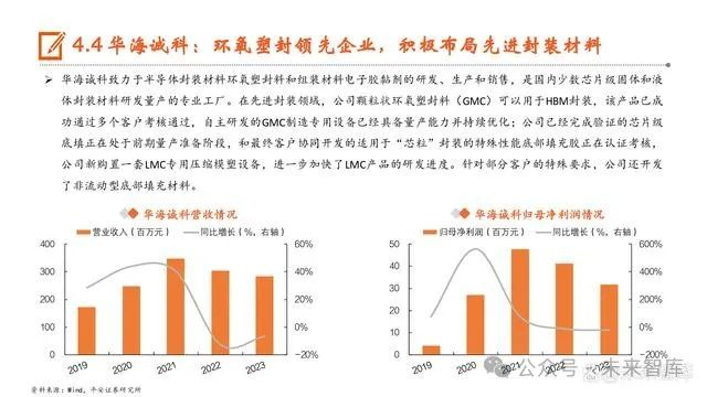 EMC(Epoxy Molding Compound,环氧树脂模塑料)为MR-MUF主要间隙填充材料。EMC是用于半导体封装的一种热 固性化学材料,由环氧树脂作为基体,并加入各种添加剂和填充剂混合而成,主要应用于半导体封装工艺中的塑封环 节,属于技术含量高、工艺难度大、知识密集型的产业环节。在塑封过程中,封装厂商主要采用传递成型法将环氧塑 封料挤压入模腔并将其中的半导体芯片包埋,在模腔内交联固化成型后成为具有一定结构外型的半导体器件。当前SK 海力士使用MR-MUF技术时主要采用EMC进行芯片间隙填充。