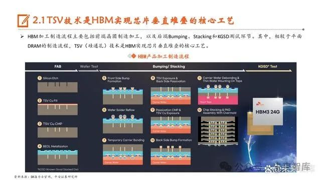 HBM加工制造流程主要包括前端晶圆制造加工,以及后端Bumping、Stacking和KGSD测试环节。其中,相较于平面 DRAM的制造流程,TSV(硅通孔)技术是HBM实现芯片垂直堆叠的核心工艺。