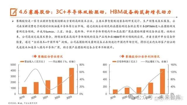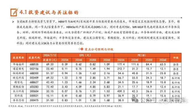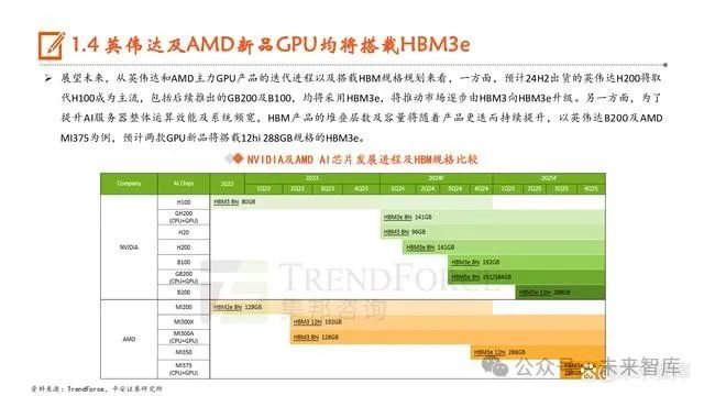 展望未来,从英伟达和AMD主力GPU产品的迭代进程以及搭载HBM规格规划来看,一方面,预计24H2出货的英伟达H200将取 代H100成为主流,包括后续推出的GB200及B100,均将采用HBM3e,将推动市场逐步由HBM3向HBM3e升级。另一方面,为了 提升AI服务器整体运算效能及系统频宽,HBM产品的堆叠层数及容量将随着产品更迭而持续提升,以英伟达B200及AMD MI375为例,预计两款GPU新品将搭载12hi 288GB规格的HBM3e。