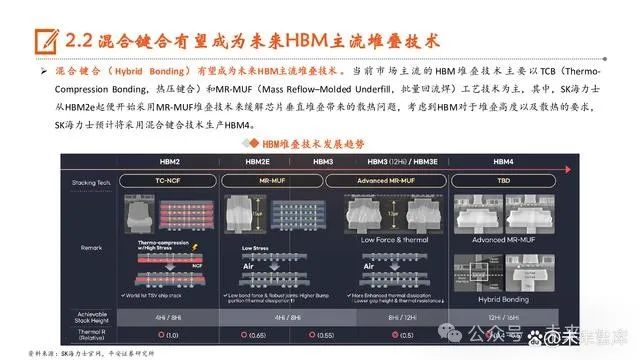 混合键合 ( Hybrid Bonding) 有望成为未来HBM主流堆叠技术 。 当 前 市 场主 流 的 HBM 堆 叠技 术 主 要以 TCB(ThermoCompression Bonding,热压键合)和MR-MUF(Mass Reflow–Molded Underfill,批量回流焊)工艺技术为主,其中,SK海力士 从HBM2e起便开始采用MR-MUF堆叠技术来缓解芯片垂直堆叠带来的散热问题,考虑到HBM对于堆叠高度以及散热的要求, SK海力士预计将采用混合键合技术生产HBM4。