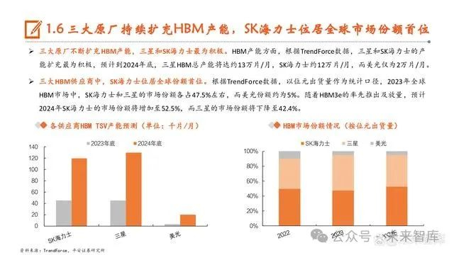 韩系厂商为当前HBM市场绝对主力供应。SK海力士作为AI存储领域先行者,产品覆盖HBM全世代产品,得益于先行优势,SK海力士市 占率全球领先并成为英伟达核心HBM供应商,三星则凭借其在存储领域长期积累的技术实力以及和AMD保持的长期战略伙伴关系,相 关产品持续通过验证并放量,市场份额紧随SK海力士,而美光不论是供应产能还是市场份额方面均有所落后,选择跳过HBM3直接进入 HBM3e。从HBM3e供应进展来看,根据TrendForce,24Q1 SK海力士率先通过验证,美光紧跟其后,并计划于24Q1量产HBM3e产品,三 星由于递交样品时点相对略晚,预计其HBM3e将于24Q2才开始正式出货。