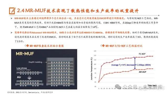 MR-MUF技术主要通过回流焊将多个芯片粘合在一起,并在芯片之间使用液态EMC材料进行间隙填充。与传统TC-NCF工艺相比,MRMUF具有更高的导热效率,有助于改善HBM因为堆叠层数增加而导致的散热问题,以8Hi HBM为例,在2Gbps引脚速率的相同工作条件 下,使用MR-MUF工艺的HBM产品相较TC-NCF工艺在最大结温方面降低了14℃。
