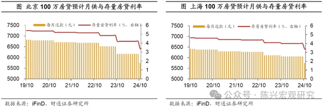 进一步减轻借款人月供负担。若按照100万元按揭贷款、等额本息还款计算,存量按揭利率下调50BP预计能降低借款人月供约260元。具体而言,以北京、上海两地2019年前签订的20年等额本息的100万元房贷偿还情况为例:2023年10月北京部分存量房贷利率可执行LPR+0BP标准,调整后最低利率由4.85%降为4.2%,为借款人节约月供约350元;若本次存量房贷利率由4.2%下调至北京主流银行新发放房贷利率3.4%,为借款人节约月供约420元。而在上海地区,假设购房者自2019年10月起享有最低LPR-20BP贷款利率,受去年存量房贷利率下调政策影响小,若房贷利率由最低4.0%下调至上海主流银行新发放房贷利率3.4%,可节约月供约310元。