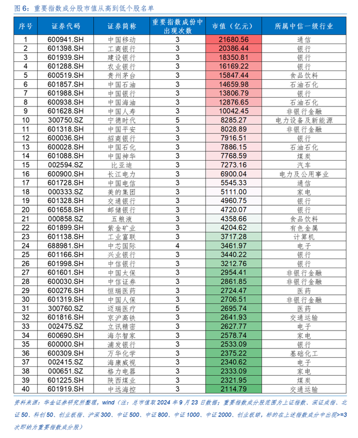 关注市值管理相关标的。(1)证监会要求长期破净公司制定价值提升计划,评估实施效果并公开披露,形成市场约束。我们将全部A股中2021-2024Q2期间PB估值维持在0-1区间的破净个股列出,宇信科技、ST旭电、ST旭蓝、美凯龙等210家公司值得关注。(2)证监会要求主要指数成份股公司切实负起责任,制定市值管理制度,明确职责和应对措施,定期披露执行情况等。据此,我们将重要指数范围划定为上证指数、深证成指、北证50、科创50、创业板指、沪深300、中证500、中证800、中证1000、中证2000、创业板综,标的在上述指数成分中出现>=3次即纳为重要指数成分股,之后用总市值(2024/9/23数据)从高到低排序,得到856只标的,其中排名靠前标的以银行、非银、食品饮料、石油石化、电力及公用事业等行业居多。