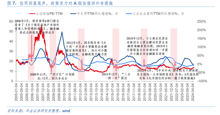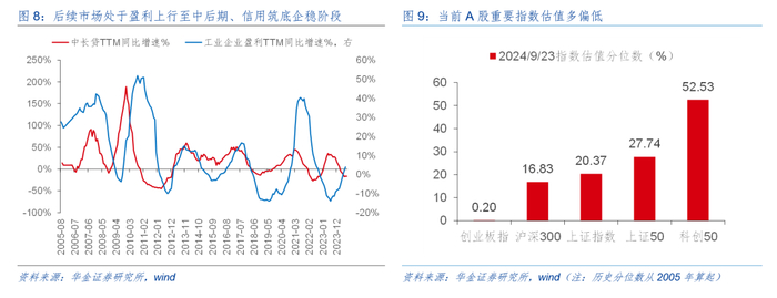 中期维度来看,信用筑底时需强政策抬升,后续A股估值可能修复。(1)当前处于盈利上行至中后期,信用筑底企稳的阶段,而强政策是抬升信用和估值的核心。一是盈利上行至中后期,信用筑底企稳:首先从盈利自身周期、其领先指标来看,均指向四季度盈利大概率延续回升趋势,但可能已至中后期;其次信用周期自2023年7月见顶,至今仍在回落,但地产政策和财政政策发力下,居民中长贷(挂钩房贷)和企业中长贷(挂钩基建投资和出口增速)后续可能改善,因此四季度信用大概率筑底后企稳。二是信用筑底时政策对其有提振:首先居民中长贷上行主要受地产宽松政策推动,居民中长贷回升期间房市表现偏强,且地产宽松的政策是推动房价和居民中长贷上行的主要因素;其次企业中长贷上行主要受基建投资和出口回升推动,其中基建投资主要受财政政策发力推动,出口则受产业趋势和海外需求回升等影响。三是信用回落尾声,上证估值往往处于低位,而政策发力对估值回升有明显作用,如2006年7月放松地产政策、2008年11月“四万亿”出台、2015年12月“三去一降一补”政策出台、2018年12月民营企业家座谈会召开、2022年5月稳经济一揽子政策措施出台。(2)比照当下,本轮政策组合拳有望抬升底部信用和估值。一是当前受新质生产力、以旧换新和设备更新等政策的推动下,财政政策结合产业政策共同发力,8月新增中长贷已经出现边际企稳的迹象,本轮政策出台可能对本轮信用筑底回升形成有力支撑。二是当前A股估值仍偏低,以9月23日数据为例,上证指数、上证50、沪深300、科创50、创业板指PE历史分位数(2005年起)分别为20.6%、28.0%、16.9%、54.7%、0.2%,A股估值处于底部下有望受益于本轮强政策的出台而回升。