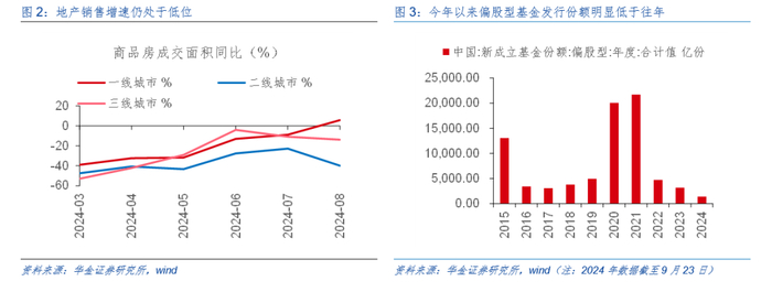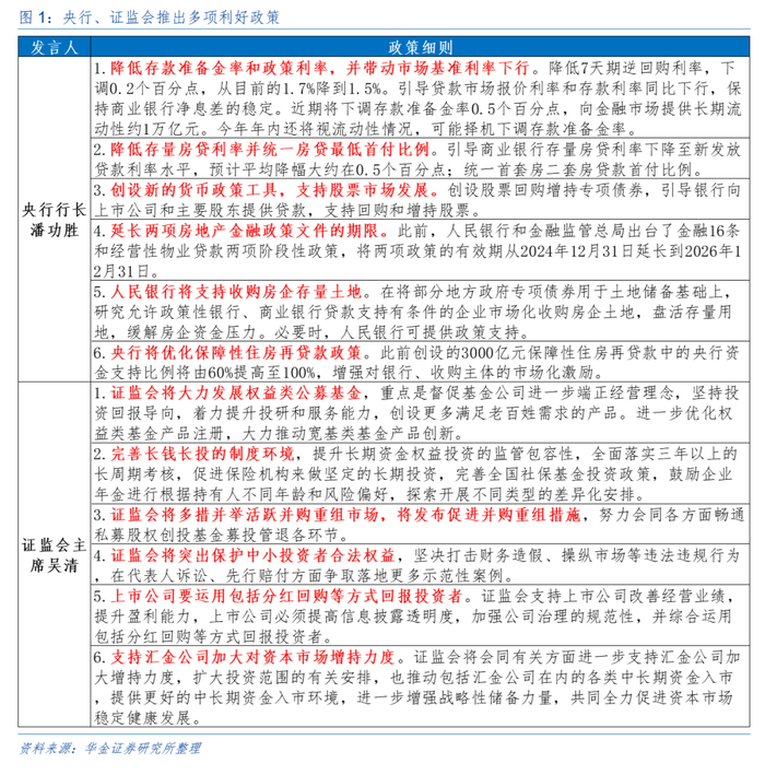 本轮央行、证监会推出多重利好政策,对资本市场和经济基本面均有提振。(1)央行加大货币政策调控强度下对基本面及流动性形成多重利好。一是积极加码地产宽松政策:当前我国经济运行偏弱的核心掣肘之一仍是有效需求不足,其中地产销售、开工增速等处于低位,本轮央行从多方面积极放宽地产相关政策,通过调降存款准备金率和政策利率、房贷利率和房贷首付比例、延长房地产政策文件期限、支持收购房企存量土地、优化保障性住房再贷款政策等方式进一步对房市形成支撑,有望持续推动后续基本面回暖。二是利率调降释放流动性:首先自9月美联储降息50BP开启全球流动性宽松周期后,市场对于央行跟进宽松的预期已经开始回升;其次临近四季度,政府债券发行加速、MLF到期量较大的环境下,降准降息的迫切性可见一斑,当前央行选择降低存款准备金率和政策利率,带动市场基准利率下行,呵护流动性维持合理充裕的同时,对市场情绪也有明显拉动,此外央行还提出“今年年内还将视流动性情况,可能择机下调存款准备金率”,后续货币政策进一步宽松的空间十分充裕,流动性和风险偏好中短期内均有望改善。三是平准基金可能入市:央行提出创设新的货币政策工具,引导银行向上市公司和主要股东提供贷款,支持回购和增持股票等指向后续平准基金可能成立入市,有望大幅改善投资者信心。(2)证监会制定中长期资金入市的指导意见推进高质量发展。一是政策有望刺激微观流动性改善:首先,证监会提出将大力发展权益类公募基金,进一步优化权益类基金产品注册,有望逆转当前权益类基金发行低迷的困境,刺激中长期资金以公募基金为渠道入市;其次,完善长钱长投的制度环境,险资、社保基金、企业年金等增量资金均可能加大权益配置比例;最后,支持汇金公司等中长期资金加大对资本市场增持力度,扩大投资范围,政策从多维度拓宽资金来源及入市途径,微观流动性有望得到充分释放。二是通过并购重组、强化监管等方式提振投资者信心:首先多措并举活跃并购重组市场,大力支持上市公司向新质生产力方向转型升级,政策积极鼓励上市公司加强产业整合,以实现高质量发展的目标;其次将加强打击财务造假、操纵市场等违法违规行为,同时持续督促上市公司加强分红回馈投资者,改善市场情绪的同时,有望进一步刺激风险偏好的回升。