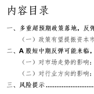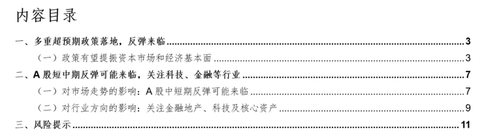 🔷金融地产、科技及核心资产行业有望受益。(1)金融地产板块:一是央行降准及大幅提升机构的资金获取能力和股票增持能力下国有大行及优质城商行、券商等金融行业;二是降低存量房贷利率及首付比例下房地产、建材建筑、家居等行业;三是地产政策大幅度放松下预计对基建需求形成拉动,美元信用走弱下铜、有色金属景气可能持续改善。(2)科技板块:首先,海内外货币宽松为科技成长提供流动性。其次,证监会将支持上市公司围绕战略性新兴产业进行并购重组下未来产业相关行业受益。最后,底部企稳后反弹期间,高景气的科技成长为占优;当下来看,短期政策催化落地下市场有望底部企稳,高景气方向指向科技成长且短期催化不断。(3)核心资产板块:首先,国内地产政策发力及美联储降息下外资可能回流;其次,基本面来看,电新、医药、食品饮料等景气上行的核心资产值得关注。