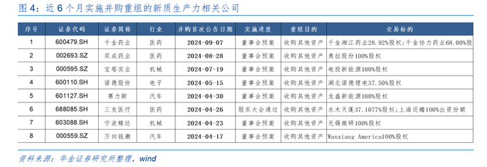 关注新质生产力并购重组方向的标的。证监会将积极支持上市公司围绕战略性新兴产业、未来产业等进行并购重组,包括开展基于转型升级等目标的跨行业并购,以及有助于补链强链、提升关键核心技术水平的未盈利资产收购,引导更多的资源要素向新质生产力方向集聚。由此,我们将新质生产力相关行业(TMT、电新、医药、机械、汽车)中近6个月内正在实施并购重组的标的进行整理,千金药业、双城药业、宝塔实业等8家公司值得关注。