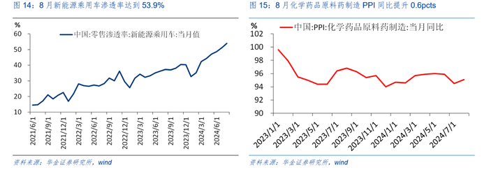 内需政策发力及美联储降息下外资可能回流,核心资产可能受益。首先,国内地产政策发力及美联储降息下外资可能回流,一是历史经验上我国地产销售同比与外资流入具有正相关性,当前降低存量房贷款利率及首付比例降低下有望提高购房意愿,地产企稳回升下外资有望回流;二是历史上美联储降息期间,外资净流入回升,且流入医药、电子、食品饮料、电力设备等核心资产行业较多,当下通胀数据降温及非农就业数据走弱压力下美联储降息,美债收益率自5月以来维持下行趋势下核心资产有望估值修复。其次,基本面来看,电新、医药、食品饮料等景气上行的核心资产值得关注:一是8月新能源汽车渗透突破50%下后续金九银十销售旺季有望继续催化新能源汽车销量、海外针对我国光伏行业的限制阶段性放缓、四季度海风项目有望放量的电新行业基本面趋暖;二是医药行业今年以来利润持续修复,库存处于低位且8月化学药品原料药制造PPI同比回暖0.6pcts下随着反腐高压阶段性消减后景气可能改善;三是食品饮料行业,内需政策发力叠加国庆出行旺季下有望带动酒店、餐饮、饮料需求复苏。