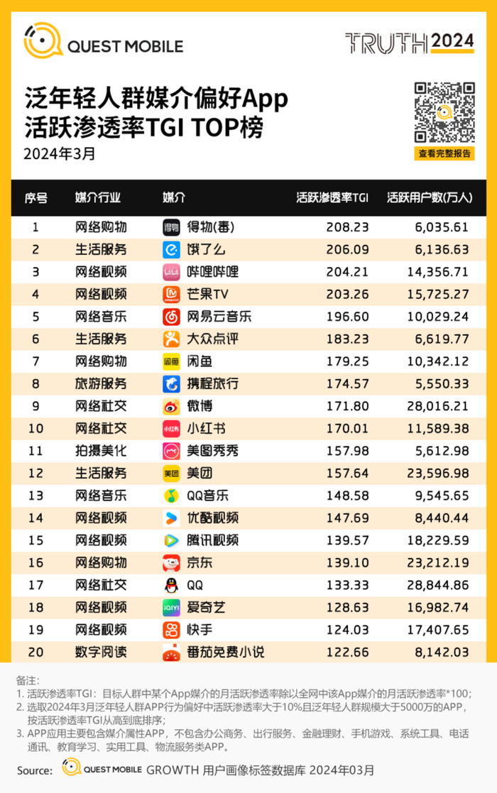 得物的社区属性进一步放大了这种潮流效应。用户不仅在得物购买商品,更通过平台分享、讨论和展示他们的潮流单品,强化了商品作为身份象征和潮流符号的地位。QuestMobile发布的报告显示,得物在“泛年轻人媒介偏好App活跃渗透率TGI榜单”中位列第一,平台渗透率高达70%。