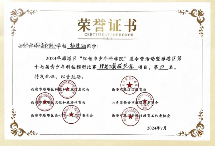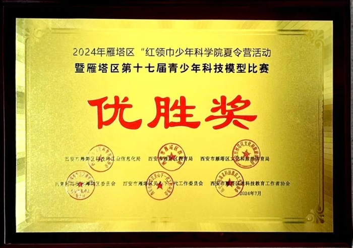 在2024年雁塔区“红领巾少年科学院”夏令营活动暨雁塔区第十七届青少年科技航模比赛中,学校王渭汉、楚一鸣老师带领航模团队刻苦训练、认真备赛,取得了优异的比赛成绩!学校荣获团体优胜奖!