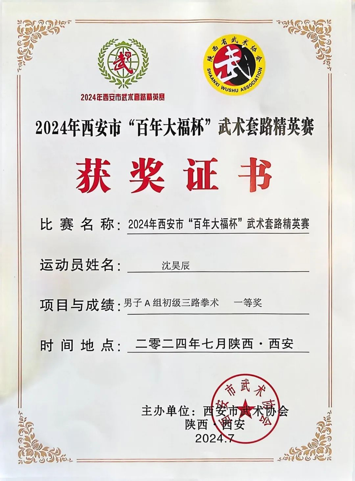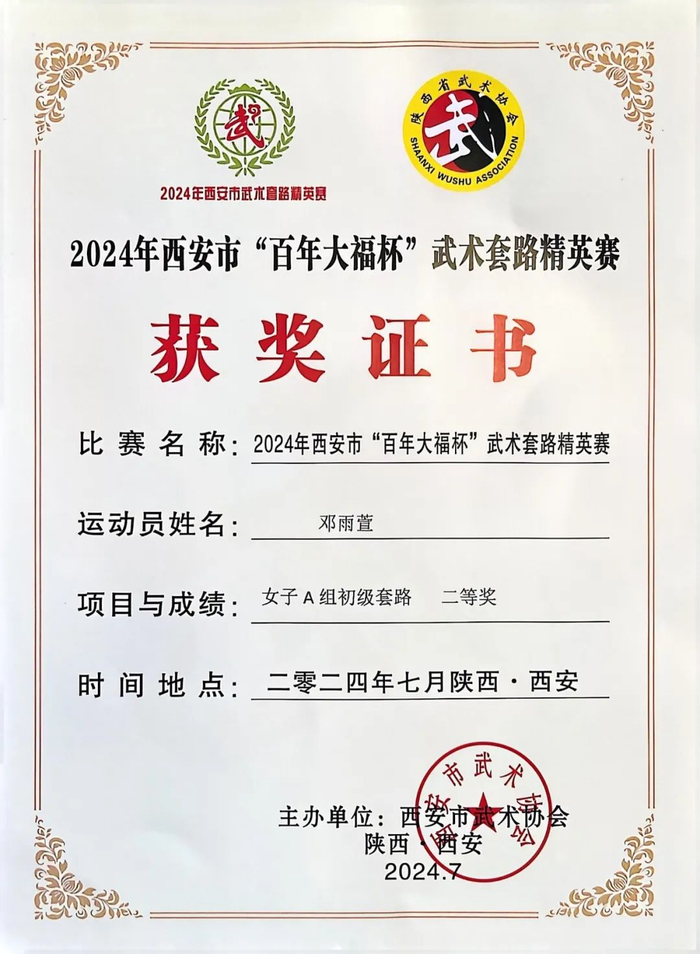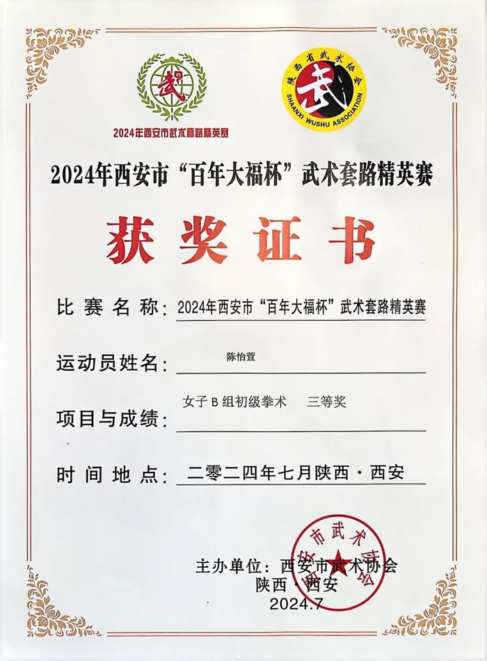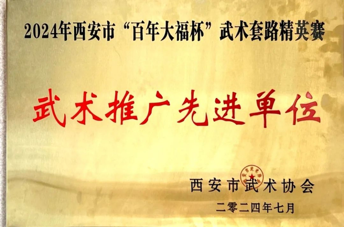 在西安市武术协会主办的2024年西安市“百年大福杯”武术套路精英赛中,学校沈昊辰获男子A组初级三路拳术一等奖、邓雨萱获女子A组初级套路二等奖、陈怡萱女子B组初级拳术三等奖,学校被评为“武术推广先进单位”。