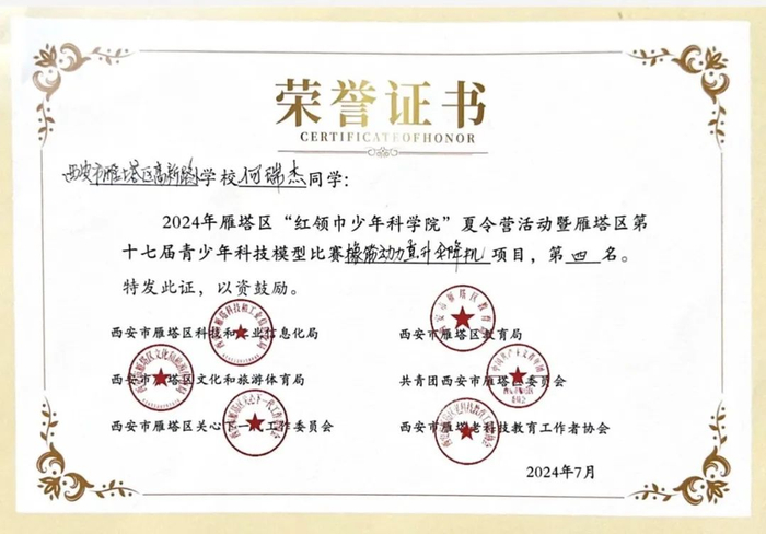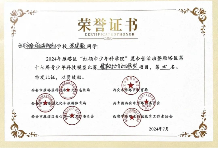 张瑞熙同学获橡筋动力自由飞模型项目第四名;何瑞杰同学获橡筋动力直升伞降机项目第四名;杨熙涵同学获弹射飞翼模型赛项目第四名。祝贺他们!