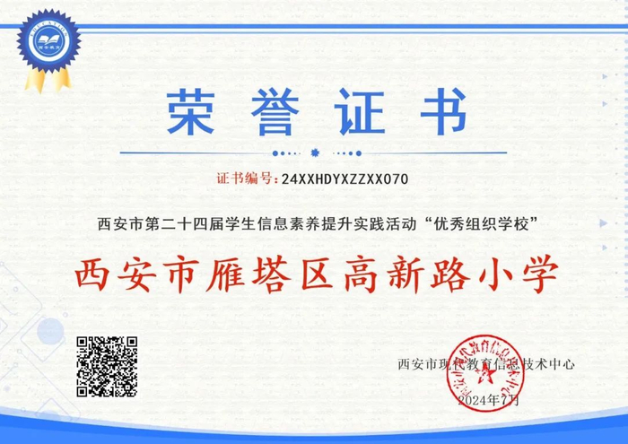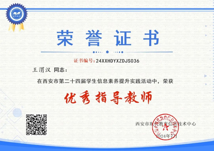 在由陕西省教育信息化管理中心指导,西安市现代教育信息技术中心主办的西安市第二十四届学生信息素养提升实践活动中,学校获“优秀组织学校奖”,王渭汉老师获“优秀指导教师奖”。