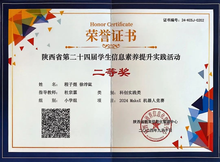 在陕西省第二十四届学生信息素养提升实践活动中,学校程子煜同学荣获科创实践类2024 MakeX 机器人竞赛项目二等奖的好成绩!