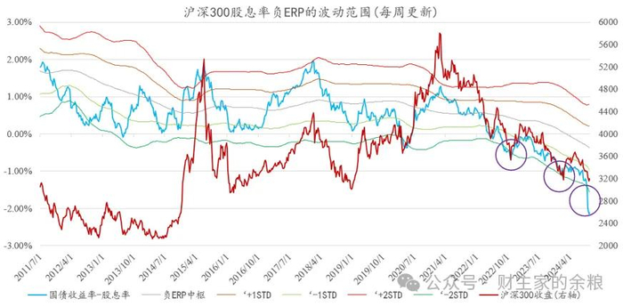 实际上,就在昨天,我还在我们小红圈的关于A股的资产模型周报中,给大家展示了这样一副图表——沪深300股息率负ERP(股权风险溢价率)的图表。