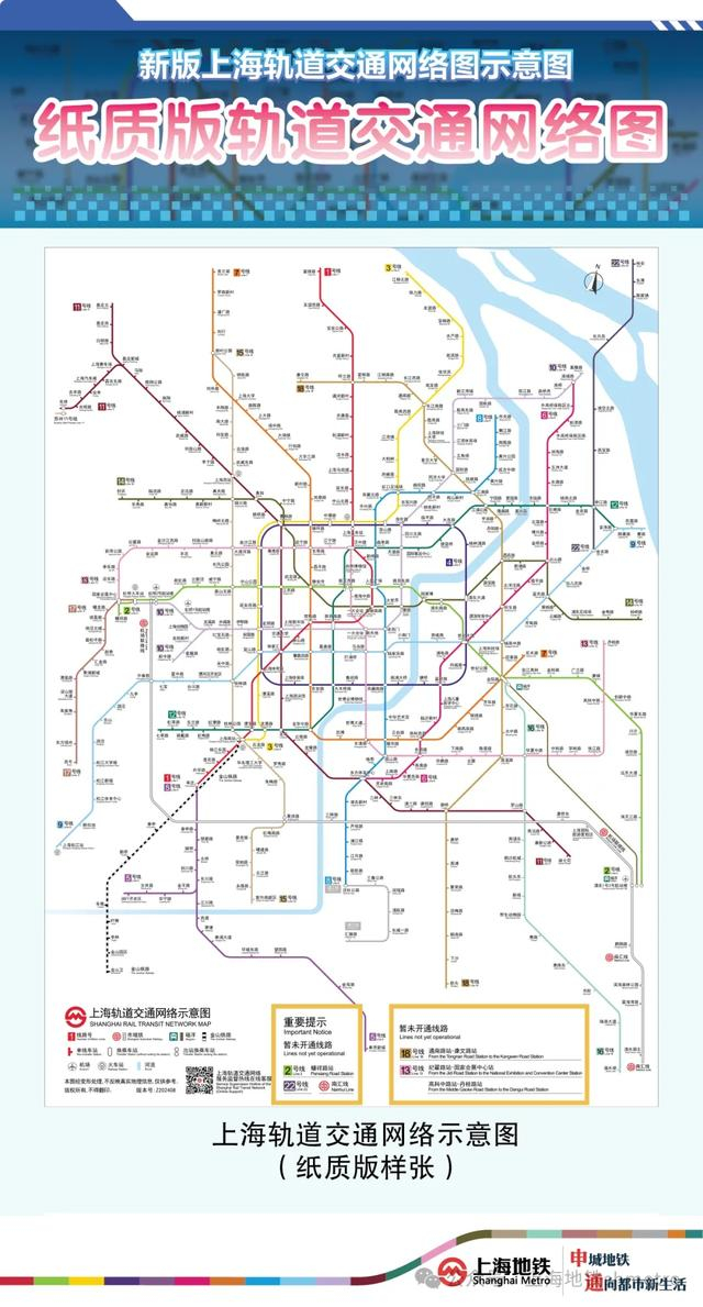 相较纸质版,电子版网络图能实时显示线网运营线路和车站展示信息与当前实际运营情况保持一致。为获取最新网络线路车站信息,建议乘客尽量通过上海地铁官网运营服务专页(service.shmetro.com)、Metro大都会APP、上海地铁官方指南APP,扫描“上海地铁在线客服”二维码或车厢内张贴的随申码等查询(扫码查询计划于9月28日起正式启用)。