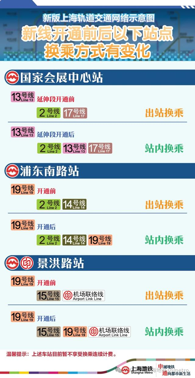 站点更名后,2/17号线的国家会展中心站,2/14号线的浦东南路站,15号线/机场联络线的景洪路站均是多条线路、同一站名。