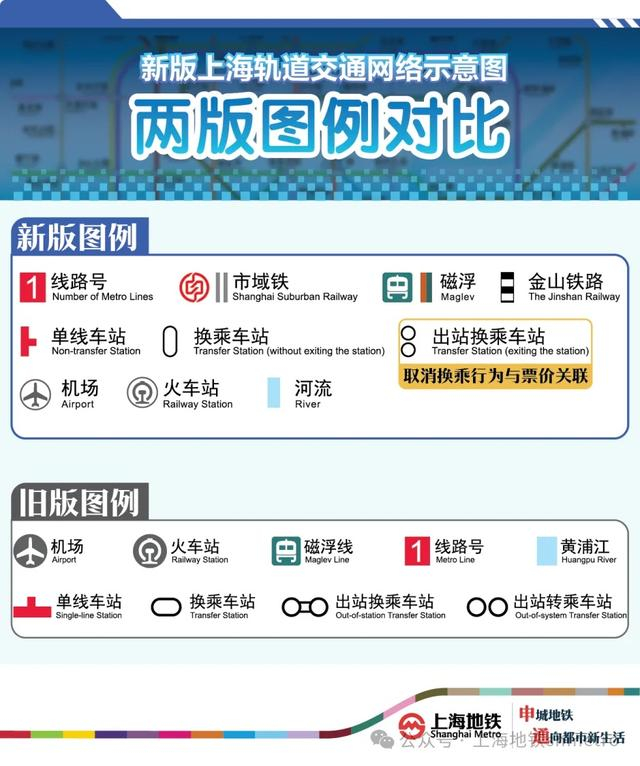 “出站换乘”图例合二为一。新版网络图中,需要出站进行换乘的车站图例,从原先“出站转乘”“出站换乘”两种表达方式,简化为“出站换乘”一种表达方式,取消换乘行为与票价关联的图示表达。